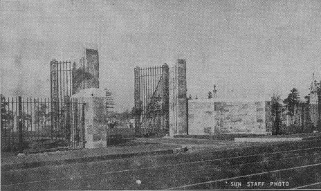 The finished product of his art is the real test of that appreciation, and it is evident that it was faultless. For nothing could more suitably adorn the level, well-kept stretches of the cemetery than the 1600 feet, of dark green iron fence, trisected as it is by gateways that are in themselves a credit to the efforts of the craftsman.