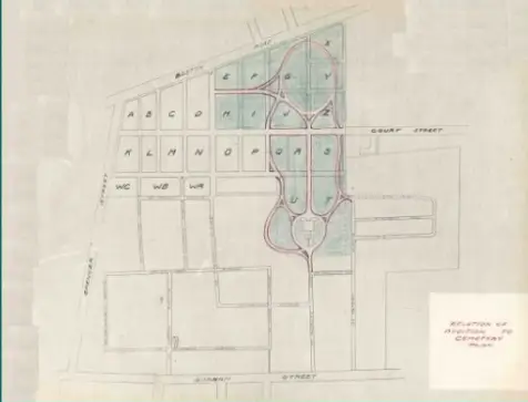The addition is bounded on the west by a public highway, on the north by a row of houses, on all other sides by older parts of the Cemetery. It is planned to insure privacy on the west and north by leaving sufficient planting space for evergreens and shrubs to form a heavy, screen and at the same time to act as backgrounds for monuments. Specimen trees and shrubs will be set out on the lawns in prominent places, mostly in irregular shaped spaces that cannot be used for burial purposes beds of annual and perennials will be set out.