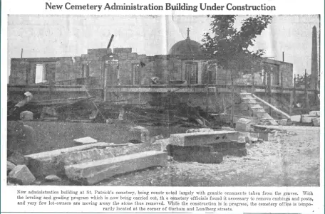 A new administration building at St. Patrick’s cemetery, made almost in its entirety from curbings which had been removed from cemetery lots, has been completed, and it stands not only as an addition to the beautiful structures of the city but also as a tribute to the zeal and cooperative effort of a few men.